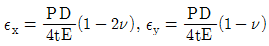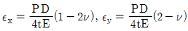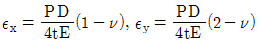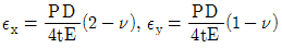 1. 원통형 압력용기에 내압 P가 작용할 때, 원통부에 발생하는 축 방향의 변형률 Єx 및 원주 방향 변형률 Єy는? (단, 강판의 두께 t는 원통의 지름 D에 비하여 충분히 작고, 강판 재료의 탄성계수 및 포아송 비는 각각 E, v이다.)