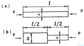 2. 그림과 같이 A,B의 원형 단면봉은 길이가 같고, 지름이 다르며, 양단에서 같은 압축하중 P를 받고 있다. 응력은 각 단면에서 균일하게 분포된다고 할 때 저장되는 탄성변형 에너지의 비 UB/UA 는 얼마가 되겠는가?