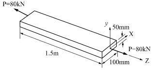 5. 다음 막대의 z방향으로 80kN의 인장력이 작용할 때 x 방향의 변형량은 몇 μm인가? (단, 탄성계수 E=200 GPa, 포아송 비 v=0.32, 막대크기 x=100mm, y=50mm, z=1.5m이다.)