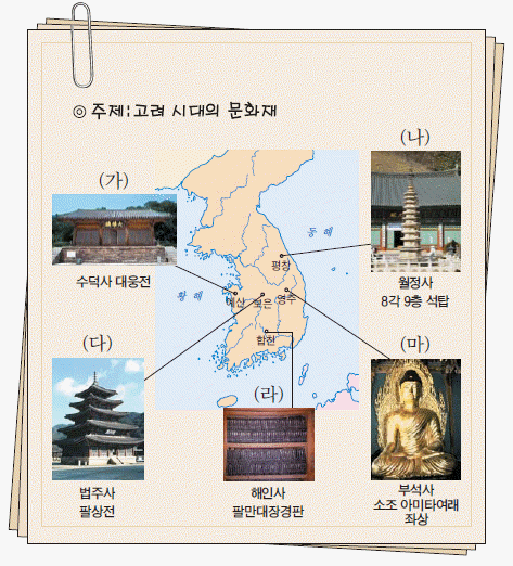 13. 보고서의 (가)~(마) 사진 가운데 고려 시대의 문화재로 옳지 않은 것은? [3점]