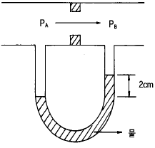 53. 그림과 같이 공기가 흐르는 관에서 압력 PA와 PB의 압력차는? (단, 물의 비중량은 1000kg/m3이며, 공기의 비중량은 무시한다.)