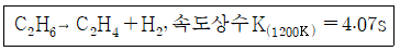 86. 다음 비가역 기초반응에 의하여 연간 2억 kg 에틸렌을 생산하는데 필요한 플러그흐름 반응기의 부피는 몇 m3 인가? (단, 압력은 8atm, 온도는 1200K 등온이며 압력강하는 무시하고 전화율 90% 를 얻고자 한다.)