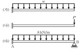 8. 그림 (가)와 (나)의 캔틸레버 보 자유단 처짐이 각각 과 일 때, 그림 (다) 보의 B 지점 수직반력의 크기[kN]는? (단, 그림의 모든 보의 길이 L=1m이고, 전 길이에 걸쳐 탄성계수는 E, 단면2차모멘트는 I이며, 보의 자중은 무시한다)