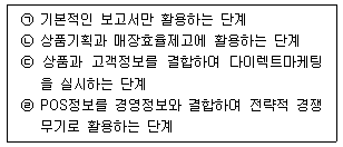 85. POS데이터의 활용을 아래 글상자의 내용과 같이 단계별로 나누어 볼 때, ㉡단계에 속하는 활동과 관련된 내용으로 가장 옳지 않은 것은?