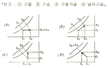 15. 다음 그림(A) ~ (D)는 습공기 선도상에 나타낸 공기조화 과정의 기본형이다. 다음의 보기를 그림의 상태와 맞추어 맞게 연결한 것은?