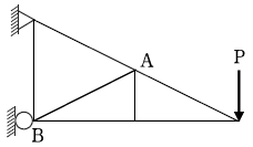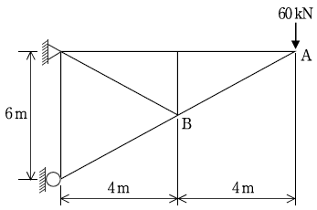 16. 다음 그림과 같은 트러스에서 AB부재에 발생하는 부재력 FAB[kN]와 탄성좌굴을 방지하기 위한 AB부재 단면의 최소 단면2차모멘트 I [cm4]는? (단, AB부재 양단의 경계조건은 힌지로 가정하고 탄성계수 E=250 GPa이다) ( 순서대로 FAB, I)