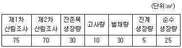 17. 다음은 10년 주기로 조사된 어느 영구표준지의 생장량 자료이다. 진계생장량을 포함하는 총생장량[m3]은?