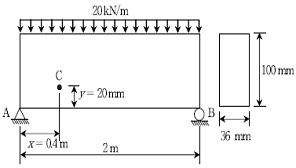 11. 그림과 같이 직사각형 단면을 갖는 단순보내의 C점(x=0.4m, y=20mm)에 작용하는 수직응력 σ[MPa]는? (단, 단순보의 자중은 무시한다)