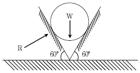 3. 무게가 W인 구가 그림과 같이 마찰이 없는 두 벽면사이에 놓여있을 때, 반력 R의 크기는? (단, 구의 재질은 균질하며 무게중심은 구의 중앙에 위치한다)