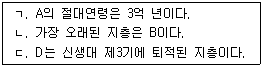 35. (가)는 어느 지역의 지질 단면도이고, (나)는 방사성 원소 X 의 붕괴 곡선을 나타낸 것이다. (가)의 A와 C에 포함된 방사성 원소 X의 양은 붕괴 후 각각 처음 양의 1/8 과 1/4 로 감소하였다. 지층 A∼D에 관한 설명으로 옳은 것만을 보기에서 있는 대로 고른 것은?