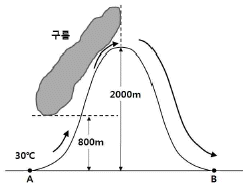 37. 그림은 30℃인 공기가 A 지점에서 상승하여 800m 에서 구름을 형성한 후, 산을 넘어가는 과정을 나타낸 것이다. B 지점에 도달하였을 때 이 공기의 온도는? (단, 건조 단열 감률은 1℃/100m, 습윤 단열 감률은 0.5℃/100m, 이슬점 감률은 0.2℃/100m이다.)