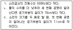 1. 그림과 같이 한쪽 끝이 열린 실린더 위에서 소리굽쇠를 쳤다. 실린더에 담긴 물의 수위를 낮추며 실린더의 울림소리와 소리굽쇠가 공명할 때마다 실린더 공기부분의 길이를 측정하였다. 첫 번째, 두 번째 공명에서 그 길이가 각각 14.2 cm와 44.2 cm일 때, 이에 대한 설명으로 옳은 것만을 보기에서 있는 대로 고른 것은? (단, 공기 중에서 음속은 340 m/s 이다.)