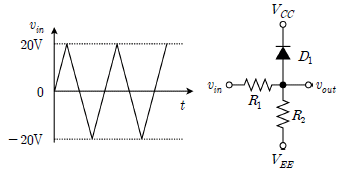 20. 다음 회로에서 입력신호 vin이 가해질 때 얻어지는 출력 vout의 파형은? (단, VCC=5[V], VEE=0[V], R1=1[kΩ], R2=1[kΩ]이고, CD,on=0.7[V]이다.)