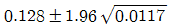 92. 지난 해 C대학 야구팀은 총 77게임을 하였는데 37번의 홈경기에서 26게임을 이긴 반면에 40번의 원정경기에서는 23게임을 이겼다. 홈경기 승률()과 원정경기 승률() 간의 차이에 대한 95% 신뢰구간으로 옳은 것은? (단, 이며, 표준정규분포에서 P(Z≥1.65)=0.05이고 P(Z≥1.96)=0.025 이다.)