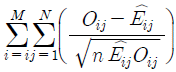 80. 행변수가 M 개의 범주를 갖고 열 번수가 N 개의 범주를 갖는 분할표에서 행변수와 열변수가 서로 독립인지를 검정하고자 한다. (i, j) 셀의 관측도수를 Oij, 귀무가설하에서의 기대도수의 추정치를 라 할 때, 이 검정을 위한 검정 통계량은?