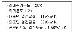 109. 다음과 같은 조건에서 두께 20cm인 콘크리트벽체를 통과한 손실열량은?