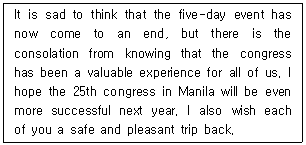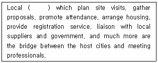 - ③ 사무총장과 그의 일행이 회의계약과 준비회의를 위해 개최국을 9월중에 방문할 예정이며, 규정에 따라 호스트국가가 모든 경비를 부담한다.