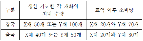 20. 표는 X재와 Y재만을 생산하는 갑국과 을국이 비교우위 상품만 생산하여 교역한 결과이다. 이에 대한 설명으로 옳은 것은? (단, 생산 가능 곡선은 직선이다.) [3점]