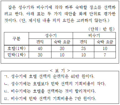 - ③ 갑이 수익성을 최우선으로 한다면 A를 선택할 것이다.
