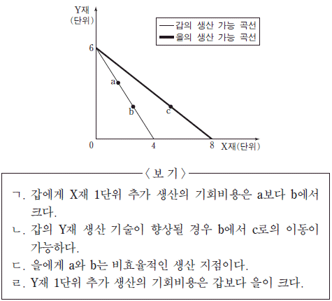 2. 그림은 갑과 을의 생산 가능 곡선을 나타낸다. 이에 대한 옳은 설명을 <보기>에서 고른 것은?