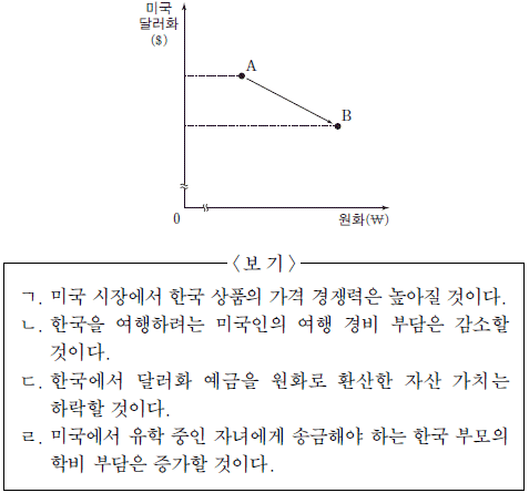 9. 그림의 A와 B는 서로 다른 시기에 외환 시장에서 시장 환율로 교환된 미국 달러화와 원화의 양을 나타낸다. A에서 B로 변한 경우에 대한 옳은 추론만을 <보기>에서 있는 대로 고른 것은? (단, 환율 변화 이외의 다른 조건은 고려하지 않는다.) [3점]