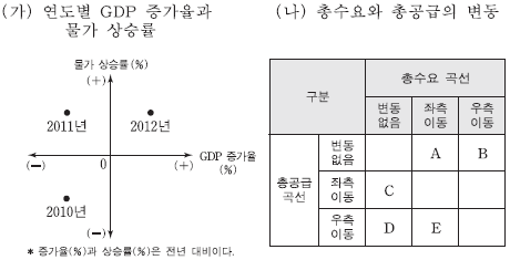18. 그림 (가)의 2010~2012년 상황을 초래한 원인으로 옳은 것을 표 (나)에서 고른 것은? (순서대로 2010년, 2011년, 2012년)