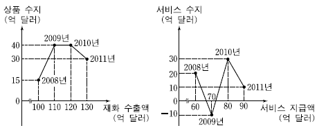 - ④ 2011년에는 재화 수입액이 서비스 수지의 달러 수취액보다 많다.