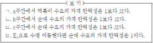15. 위 그래프에서 소비 조합이 E0에서 a∼c구간과 E1으로 각각 이동 했을 때, 이에 대한 옳은 분석을 <보기>에서 고른 것은? [3점](14번 공통지문 문제)