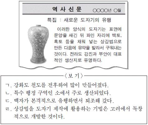 20. 다음 역사 신문에서 다루고 있는 도자기에 대한 설명으로 옳은 것만을 <보기>에서 있는 대로 고른 것은?