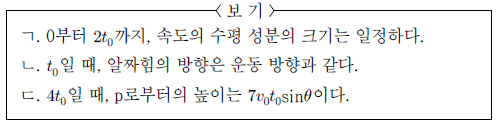 6. 그림 (가)와 같이 영희가 조종하는 무선 조종 비행기가 수평면에 대해 각 θ의 방향으로 직선 운동한다. 그림 (나)는 비행기가 점 p를 통과하는 순간부터 비행기의 속도를 시간에 따라 나타낸 것이다. 비행기의 운동에 대한 설명으로 옳은 것만을 <보기>에서 있는 대로 고른 것은? (단, 비행기의 크기는 무시한다.) [3점]