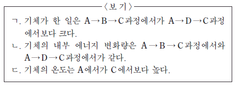 4. 그림은 각각 1 몰의 단원자 분자 이상 기체의 상태를 A→B→C 과정과 A→D→C 과정을 통해 A에서 C로 변화시킬 때 압력과 부피를 나타낸 것이다. 이에 대한 설명으로 옳은 것만을 <보기>에서 있는 대로 고른 것은?