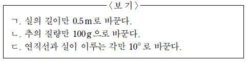 2. 다음은 단진자의 주기에 관한 실험 과정의 일부이다. <보기>와 같이 조건을 변화시켜 구한 단진자의 주기가 위에서 구한 단진자의 주기보다 작은 경우만을 있는 대로 고른 것은?