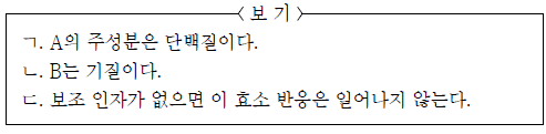 13. 그림은 보조 인자의 유무에 따른 어떤 효소 반응의 여부를 나타낸 것이다. A와 B는 각각 기질과 주효소 중 하나이다. 이에 대한 설명으로 옳은 것만을 <보기>에서 있는 대로 고른 것은?