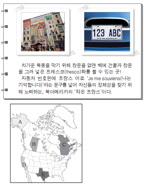 14. 자료는 북아메리카의 어느 지역을 여행하면서 기록한 것이다. 이 지역을 지도에서 고른 것은?