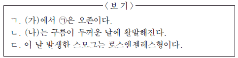 16. 그림 (가)는 어느 대도시에서 스모그가 발생한 날에 관측한 오염 물질의 농도 변화를, (나)는 이 스모그의 발생 과정을 나타낸 것이다. ㉠과 ㉡은 오존(O3)과 이산화질소(NO2) 중 하나이다. 이에 대한 설명으로 옳은 것만을 <보기>에서 있는 대로 고른 것은? [3점]