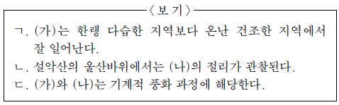 7. 그림 (가)는 물의 동결 작용에 의한 풍화 작용을, (나)는 압력의 변화에 의한 풍화 작용을 나타낸 것이다. 이에 대한 설명으로 옳은 것만을 <보기>에서 있는 대로 고른 것은?