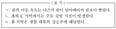 9. 그림은 나즈카 판과 남아메리카 판의 해양 지각의 연령 분포와 남아메리카 대륙 주변의 판 경계를 나타낸 것이다. 이에 대한 설명으로 옳은 것만을 <보기>에서 있는 대로 고른 것은? [3점]