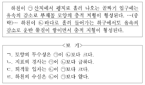 5. 다음 글은 하천 지형에 관한 것이다. ㄱ과 ㄴ 에 대한 옳은 설명을 <보기>에서 고른 것은?