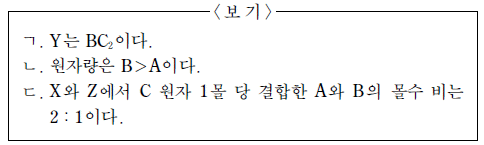 12. 그림은 화합물 ABC의 화학 결합 모형을, 표는 화합물 X, Y의 화학식의 구성 원자 수를 나타낸 것이다. 이에 대한 설명으로 옳은 것만을 <보기>에서 있는 대로 고른 것은? (단, A~C는 임의의 원소 기호이다.) [3점]