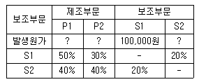 7. (주)한강은 두 개의 제조부문(P1, P2)과 두 개의 보조부문(S1, S2)으로 운영된다. 회사는 단계배부법을 이용하여 보조부문비를 제조부문에 배부하고 있으며, 각 보조부문의 용역제공비율은 다음과 같았다. 회사는 S1 보조부문부터 원가배부하며, 두 개의 보조부문(S1, S2)으로부터 P1에 배부된 금액은 ₩110,000인 경우 보조부문 S2에서 발생한 원가는 얼마인가?