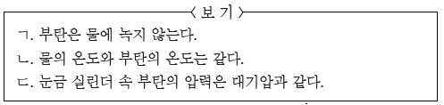 3. 다음은 부탄(C4H10)의 분자량을 구하는 실험 과정이다. 이 실험에서 이상 기체 상태 방정식을 사용하여 부탄의 분자량을 구하기 위해 필요한 가정으로 옳은 것만을 <보기>에서 있는 대로 고른 것은?