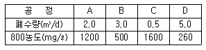11. 원료 5ton/d을 사용하는 공장의 공정별 폐수량 및 BOD농도는 아래 표와 같다. 원료 1ton당 BOD인구당량은? (단, BOD 인구당량은 40g/인· 일로 가정)