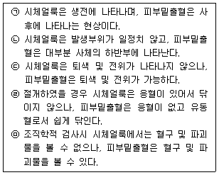 11. 시체얼룩과 피부밑출혈에 대한 비교 설명 중 틀린 것은 모두 몇 개인가?