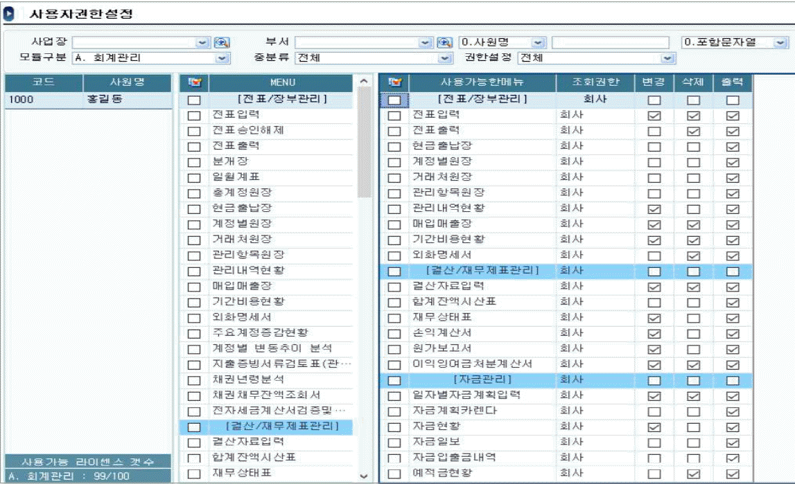 2. 다음 화면을 참고하여 홍길동 사원의 ERP 회계모듈 사용권한과 관련된 설명으로 가장 옳지 않은 것은 무엇인가?