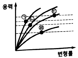 84. 인장 시험을 통해서 다음과 같은 응력-변형률 곡선을 얻었다. 그림에 나타난 재료 중에서 취성(brittleness)이 가장 큰 재료는? (단, 각 곡선에서 점 표시는 항복점을 나타내고, 곡선의 끝은 파단점을 의미한다.)