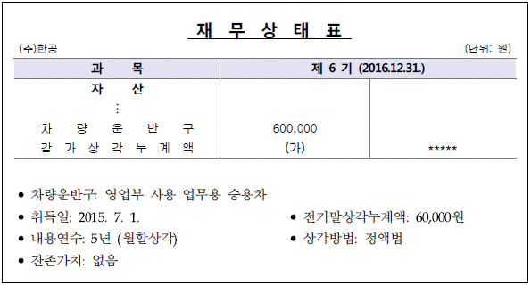 10. 다음은 (주)한공(사업연도 : 1. 1. ~ 12. 31.)의 재무상태표상 차량운반구에 관한 자료이다. (가)에 해당하는 금액으로 옳은 것은?