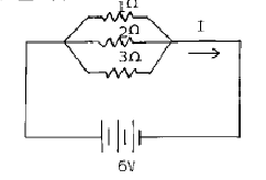 51. 그림과 같이 6V 전원에 1Ω ,2Ω ,3Ω 의 저항이 병렬로 연결되었을 때 전류(I)는 몇 A인가?