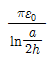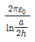 9. 지면에 평행으로 높이 h[m]에 가설된 반지름 a[m]인 가공직선 도체의 대지간 정전용량은 몇 [F/m]인가? (단, h ≫ a이다.)