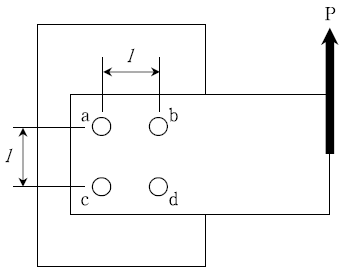 1. 다음 그림과 같이 4개의 볼트(a, b, c, d)로 체결된 브라켓 (bracket)이 편심하중 P를 받고 있을 때 각 볼트가 받는 전단응력의 관계로 옳은 것은?