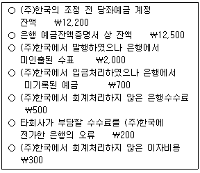 2. 다음 자료를 토대로 계산한 (주)한국의 정확한 당좌예금 잔액은?